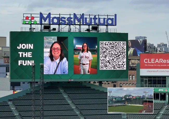 The process for a fan to see themselves up on the big screen wearing a Red Sox uniform is simple. A fan scans the QR code, uploads a selfie, and the image is sent up to the production room.